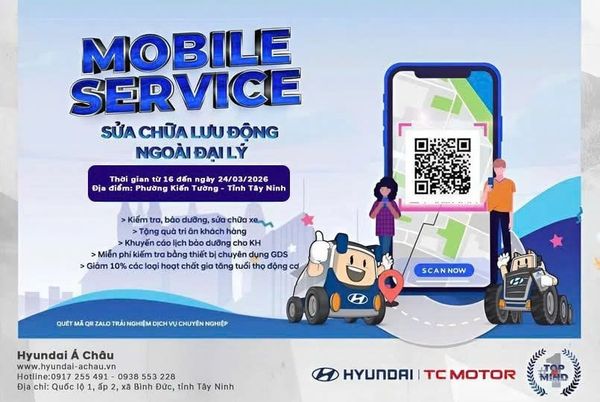 Trong tháng 3/2026, chương trình Mobile Service sẽ được tổ chức tại Phường Kiến Tường, tỉnh Tây Ninh, diễn ra từ ngày 16/03 đến ngày 24/03/2026. Đây là cơ hội để các khách hàng đang sử dụng xe tải Hyundai tại khu vực Tây Ninh và các vùng lân cận có thể kiểm tra tình trạng xe một cách nhanh chóng, thuận tiện mà không cần di chuyển xa.