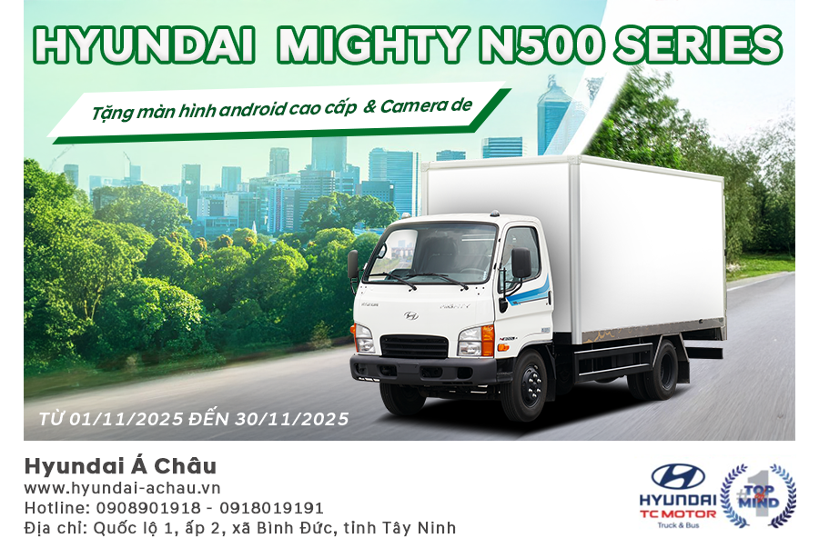 Tháng 11 này, Hyundai Á Châu gửi đến Quý khách chương trình khuyến mãi đặc biệt dành cho dòng Hyundai Mighty N500 Series – mẫu xe tải mạnh mẽ, bền bỉ và được nhiều khách hàng tin chọn cho hoạt động kinh doanh hằng ngày.