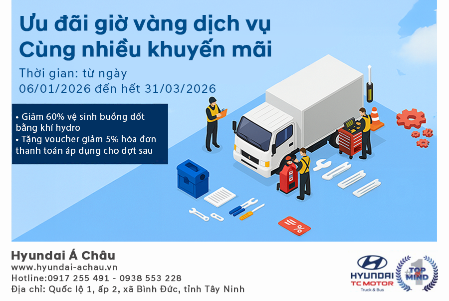 Nhằm tri ân Quý Khách hàng, Hyundai Á Châu triển khai chương trình ưu đãi giờ vàng dịch vụ với nhiều khuyến mãi hấp dẫn, giúp xe luôn vận hành bền bỉ – tiết kiệm tối đa chi phí bảo dưỡng.